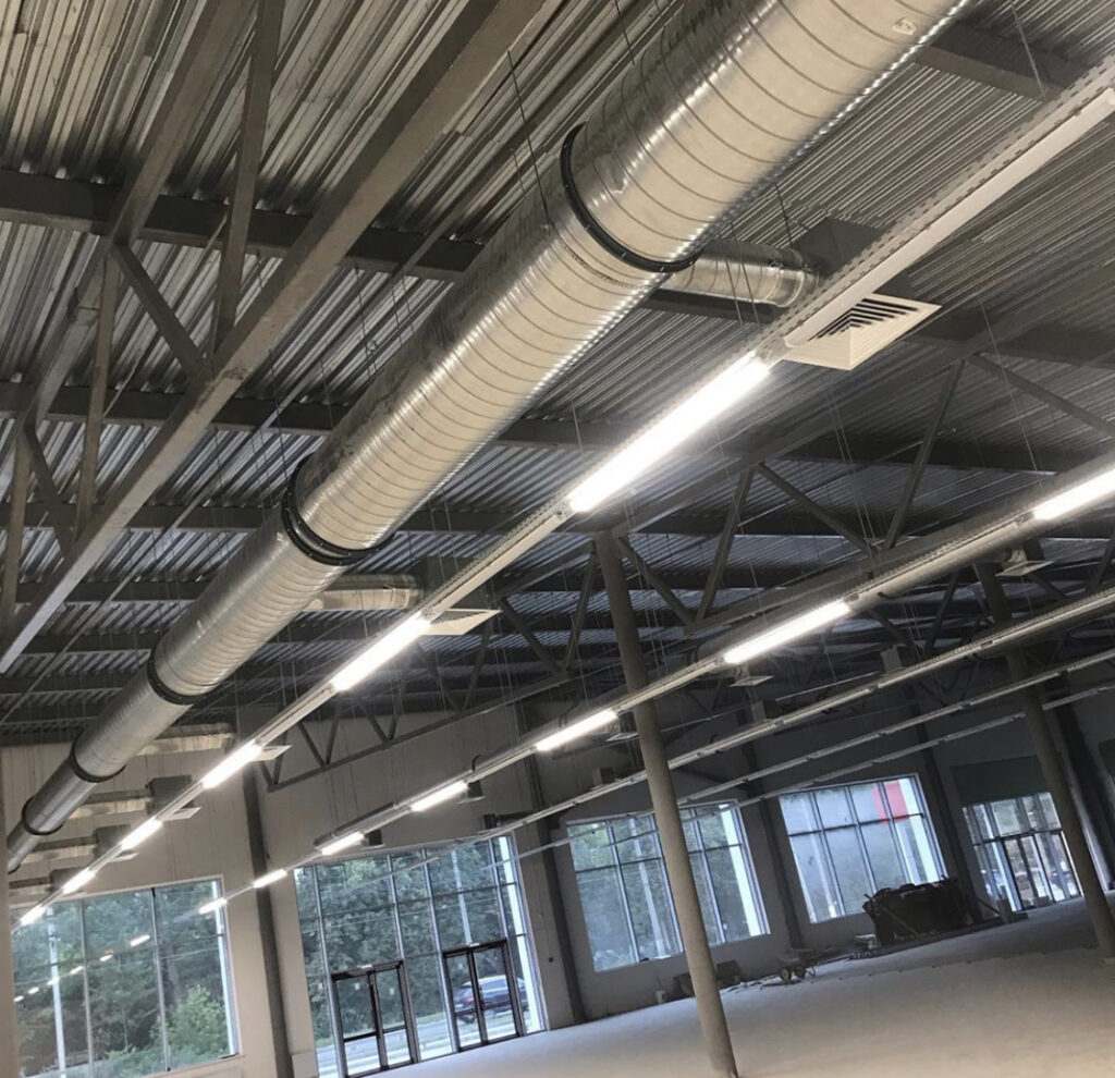 • Магазин-склад оснащается мощной приточно-вытяжной системой вентиляции. Одним из вариантов, в качестве основного агрегата использовать несколько промышленных крышных кондиционеров. При такой системе подачи воздуха в помещение отпадает надобность в вытяжных воздуховодах, а приточные не будут иметь больших разветвлений. Для подогрева воздуха в отдельных помещениях в зимний период могут использоваться калориферы для вентиляции. Но такая система применима лишь на больших однообъемных помещениях, так как не имеет возможности регулировки климатических характеристик по отдельным зонам.